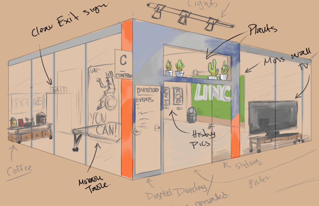 The Open Spaces & Open Minds initiative was developed in order to bring the majesty of nature into a small but comfortable Buckland Room. with my business partner Heisman Holbrook, we were able to pitch to the LINC staff our initiative to marry the beauty of foliage and natural landscape to the elements of the LINC brand identity. In order to make this work, we delved deep into the therapeutic nature of foliage and earthly elements, and while designing this environment with ADA regulations and accessibility in mind.