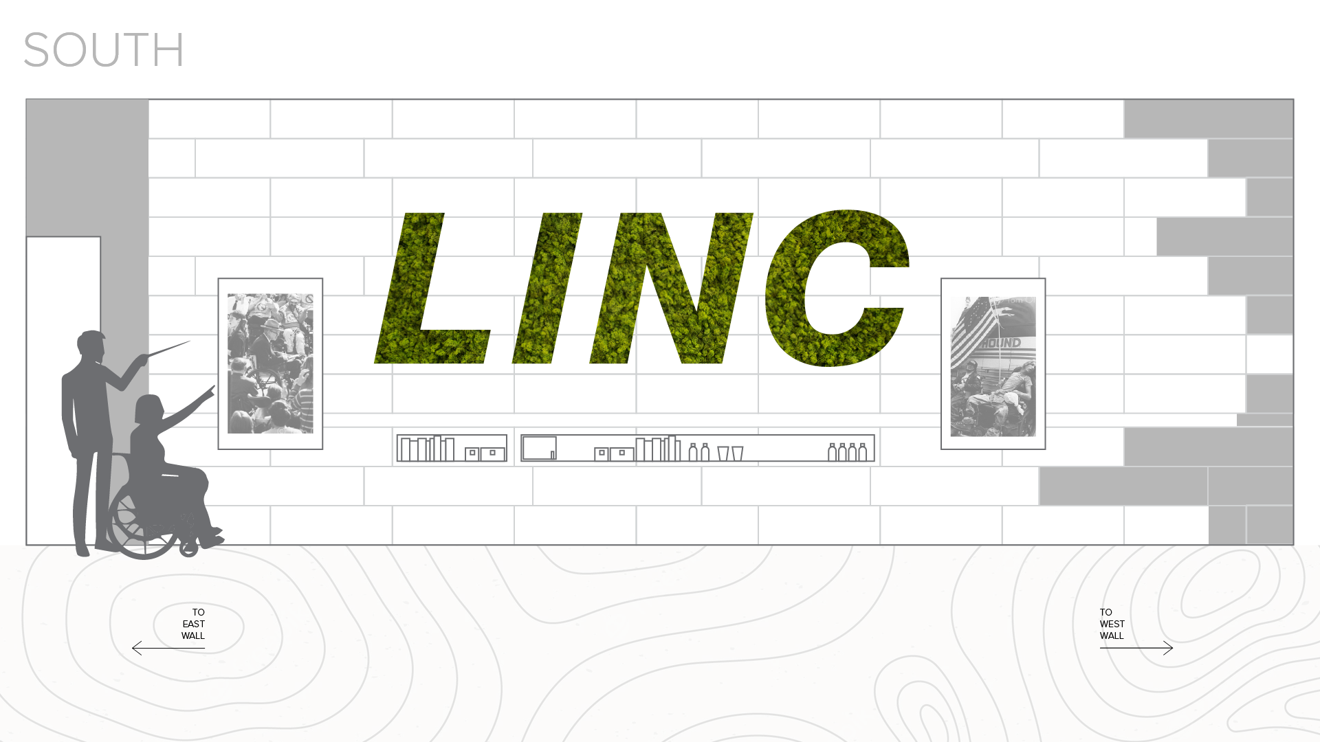 South wall featuring the LINC wordmark grown in moss. Moss helps filter cancerous and otherwise harmful pollutants, and provides as an interesting focal point for the room. Storage and live posters are situated accordingly.