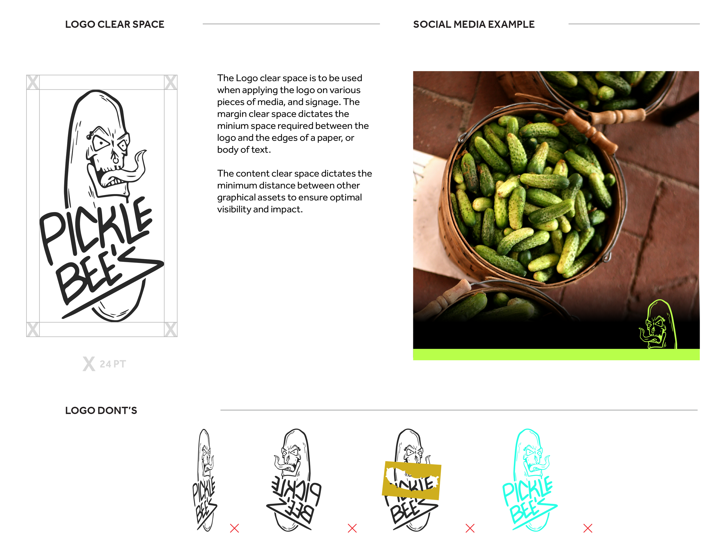 Flyer design, logo concept & brand guide pages. Picklebee’s unchosen logo and brand concept.