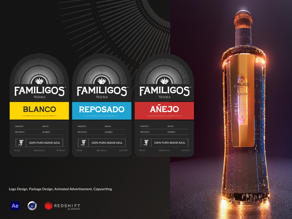 From the agave lands of Mexico, Familigos tequila takes a step above the rest with their unique and decades old tequila recipes that are sure to entice. Every bottle of Familigos tequila is infused with traditions, luxury, sophistication, and a tantalizing taste. The Familigos tequila project comprises of a complete brand identity overhaul. This includes new label designs, logo, and a fresh 30 second 3D animated video ad accompanied with a masterfully written script.